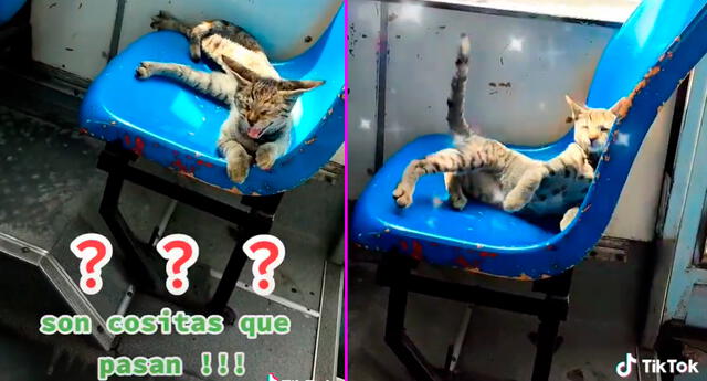 “Son cositas que pasan”, se lee en la descripción del curioso video viral de TikTok. En el clip se observa cómo el felino está echado en la silla, pero al ver en un momento dado se levanta y empieza a estirarse para luego recostarse nuevamente.