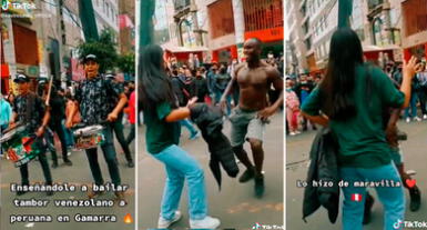“Enseñándole a bailar tambor venezolano a peruana en Gamarra”, se lee en el material audiovisual que ha logrado más de 12 mil reproducciones en la popular aplicación desde su difusión en internet.