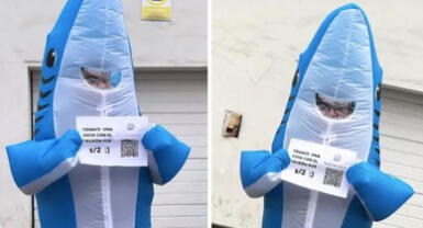Con un cartel y un código QR, el peruano se ofreció a posar ante la cámara disfrazado de tiburón por un accesible precio. “Tómate una foto con el tiburón por S/2″, fue el singular mensaje que no tardó en volverse viral en Twitter.