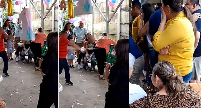 Quiso romper la piñata, pero le da un palazo a señora y es viral: “Hasta el palo se quebró” [VIDEO]