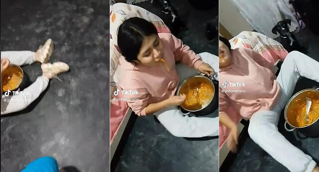 Resulta que la chica estaba sentada en su cuarto comiendo los restos de los tallarines rojos en una olla, cuando de pronto ingresa a su hermano, quien termina exponiéndola en TikTok con una singular frase de fondo.