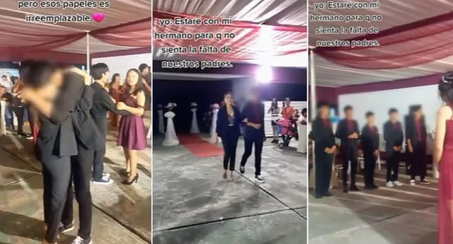 Tal como se puede ver en las imágenes virales en TikTok, una muchacha hace su ingresó a la ceremonia tomando la mano de un adolescente, quien es su hermano menor. El muchacho se emociona demasiado y llora.