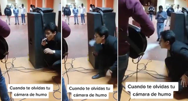 No obstante, su amigo lo ayudó y se escondió detrás del equipo de música. Asimismo, con cigarro electrónico en mano, su compañero trata de hacer humo al mismo estilo que la moderna herramienta.