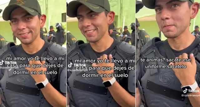 ¿Qué le dijo? En las imágenes que circulan en TikTok se observa cómo ella lo ve y queda totalmente cautivada por su belleza. "Mi amor, yo te llevo mi casa para que dejes de dormir en el suelo ¿Te animas? Sácate eso (en referencia al uniforme)", dijo en el material audiovisual que ha logrado más de dos millones de reproducciones en la popular aplicación.
