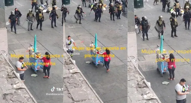 Estaba en medio de la marcha contra Dina Boluarte y buscaba seguir vendiendo. Un usuario en TikTok captó el momento.