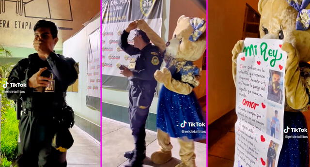 El oficial, quien no sabía lo que estaba a punto de pasar, salió bastante sorprendido de la oficina a ver qué es lo que tenían para él, sin embargo, nunca imaginó que encontraría una osita en tamaño real quien le tenía una serie de regalos, entre ellos una gigantesca carta, además de un peluche, dulces y un globo.