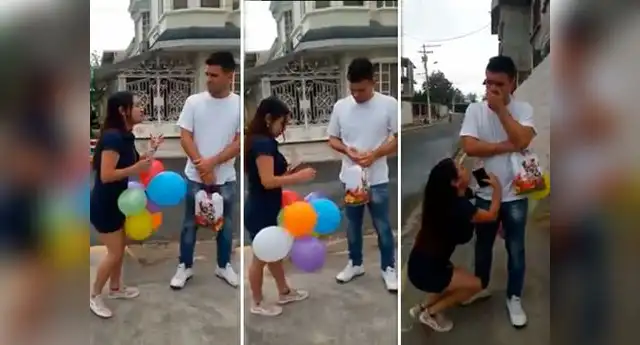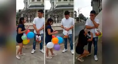 En YouTube una joven, que habría sido infiel en la relación, encontró a su exnovio en la calle y no tuvo mejor idea que acercarse a él y, con un regalo y globos en manos, le pidió que pensará bien las cosas para retomar su relación. No contenta, la mujer le cantó delante de todos provocando vergüenza en el chico.