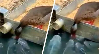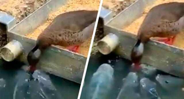 En el video se puede observar el preciso momento en el que un pato saca un poco de comida con su pico y alimenta a cada uno de los peces que se aglomeran a un lado para que le caiga comida abriendo su boca.