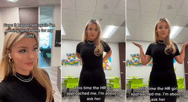 En este caso, usó un vestido más brillante, acompañado de un blazer negro, y, en ese momento, se encontraba un hombre como personal de Recursos Humanos. Tras un breve dialogo con la persona, le pregunta si se encuentra bien vestida para el trabajo.