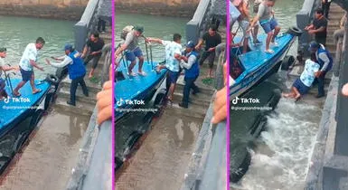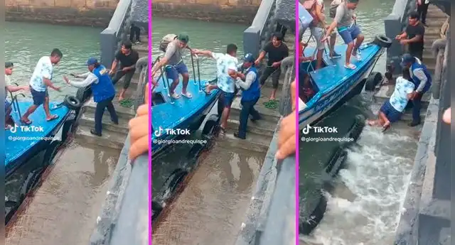 En el video viral se puede ver el preciso momento en que el hombre está a bordo de un pequeño bote azul, cuando de pronto llega el momento de bajar. Para ello, el instructor le pide que espere unos minutos hasta que la marea baje un poco, cuando de pronto el hombre decide hace caso omiso y termina cayendo al agua.