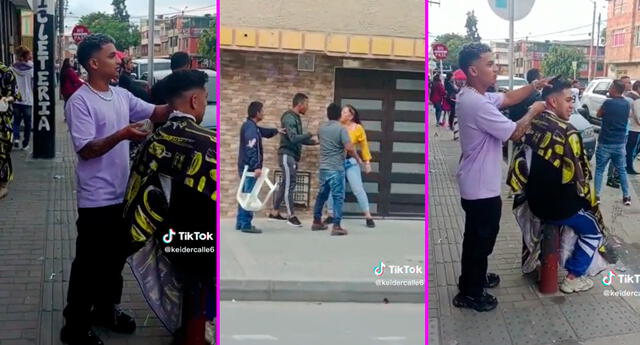 Sin dejar a su cliente, el joven agarró su máquina de afeitar y su cobertor para el cabello para hacer su trabajo desde otro punto de su local, específicamente la calle y así poder bien la pelea que estaba sucediendo en frente de su peluquería.