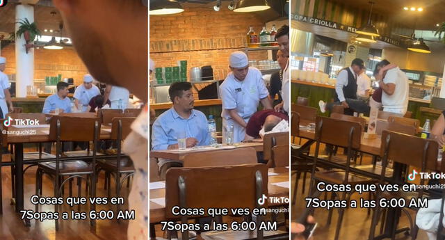 La cuenta de TikTok @sanguchi25 difundió la singular escena que muestra cómo un grupo de amigos tienen problemas en conocido restaurante peruano ‘7 sopas’, debido a que uno de ellos estaba bajo los efectos del alcohol al punto de ser vencido por el sueño.