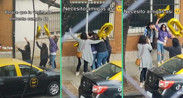 La mujer se mostró emocionada desde su balcón, por lo que bajó para agradecer a sus amistades con un efusivo abrazo y seguir cantando mencionado tema. Esta escena fue grabada por una vecina, quién se mostró emocionada por la inolvidable sorpresa, por lo que escribió querer “ tener amigas así”.