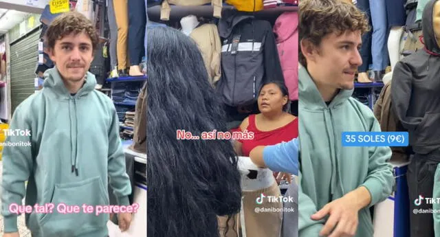 El español tiktoker se decidió por una polera de invierno y cuando se consulta por el precio le responde que está a 35 soles y quien grababa, en ese momento se le escucha pedir alguna rebaja para así se lleve más prendas.