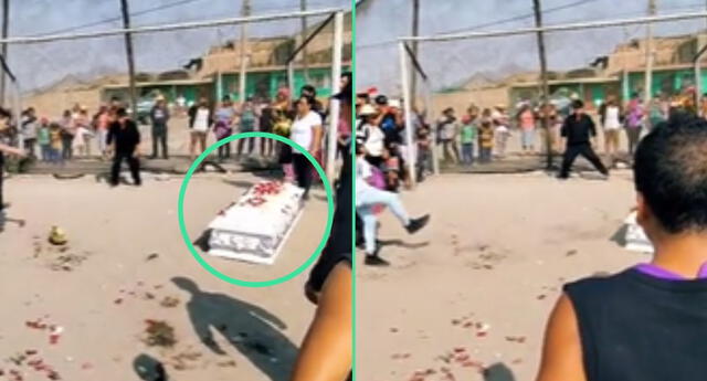 Tal como se puede apreciar en las imágenes compartidas por @jossbernalf, se puede apreciar a un grupo de personas y unos hombres jugando partido en una cancha de fútbol. Sin embargo, lo más sorprendente estaría por venir y es que en la escena se encontraba nada más y nada menos que un ataúd en el suelo con unas flores.