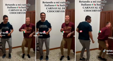 “Retando a mi cuñado italiano a bailar carnaval de chocorvos”, se lee en el video viral que ha superado el millón de reproducciones, 53 mil ‘Me gusta’ y miles de comentarios en la app china de TikTok.