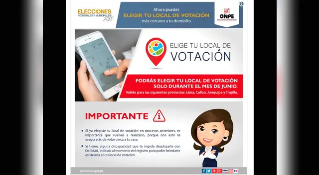 La oportunidad de elegir el centro de votación está habilitada solo para las provincias de Lima, Callao, Trujillo y Arequipa. ONPE precisó que si el ciudadano ya escogió su local de votación en procesos anteriores, es importante que vuelva a realizar la elección porque solo así se podrá asegurar de votar cerca de su domicilio.