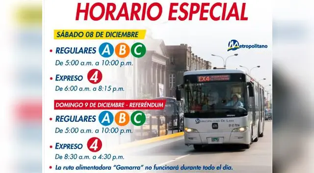 Para facilitar a la ciudadanía un medio de transporte durante el Referéndum 2018, Protransporte informó que ha dispuesto que, además de los servicios Regulares A, B y C del Metropolitano, que brindarán atención en su horario habitual de día domingo, opere también el Servicio Expreso 4 desde las 8:30 a.m. hasta las 4:30 p.m.