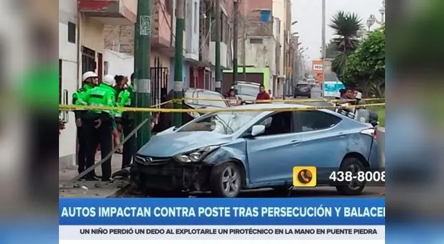 Según versión de la oyente Roxana Uceda, al promediar las 6:00 a.m., dos automóviles conducidos por presuntos delincuentes se estrellaron cuando huían de la Policía en medio de una balacera. La denunciante dijo que uno de ellos se empotró contra un poste de alumbrado público, que quedó inclinado y puede caerse en cualquier momento.