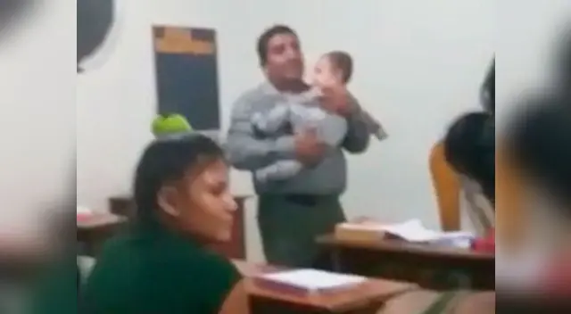 En las imágenes se aprecia al docente cargando a Adrián de 5 meses de edad, que en todo momento se mostró tranquilo, mientras explica a sus alumnos la práctica calificada.